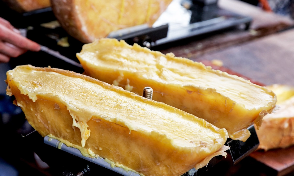à base de Gruyère suisse et de vacherin fribourgeois, accompagnée de pommes de terre en robe des champs et de charcuteries - La Truffière