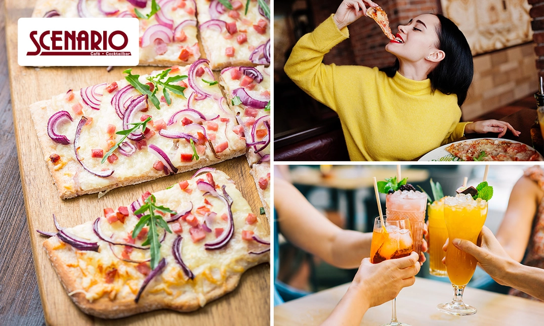 Mache es Dir bei Scenario im Herzen Aachens gemütlich! Das freundliche Personal und die liebevoll angerichteten Leckereien sorgen für eine angenehme Atmosphäre. Entscheide Dich für einen Flammkuchen oder für eine Pizza nach Wahl. Du darfst Dir auch einen Jumbo Cocktail (0,5 l) aus der umfangreichen Cocktailkarte aussuchen. Entscheide Dich zum Beispiel für einen tropischen Piña Colada, einen exotischen Mojito oder einen fruchtigen Sex on the Beach. Selbstverständlich stehen auch alkoholfreie Cocktails auf der Karte. Lass es Dir schmecken!
