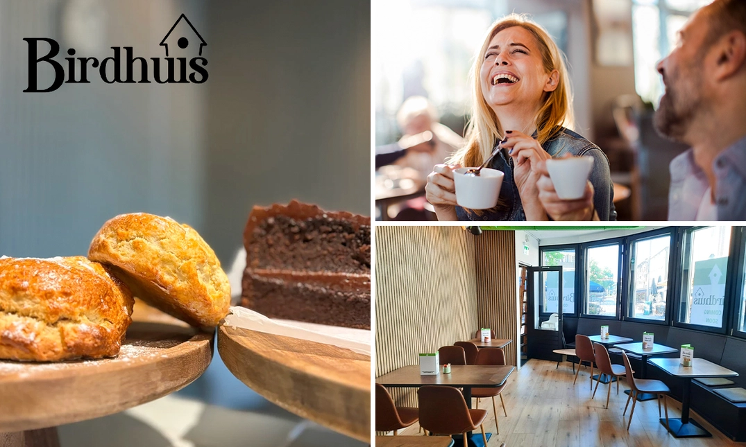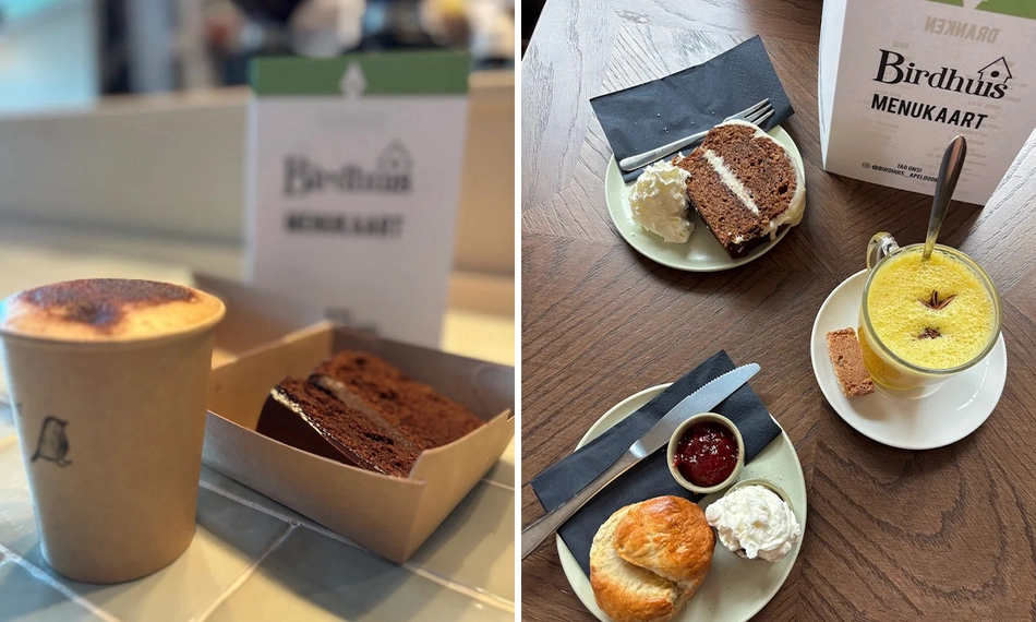 Geniet van een zoete proeverij en een warme drank naar keuze bij Birdhuis in het centrum van Apeldoorn: met een halve carrot cake, halve chocolatecake en een scone