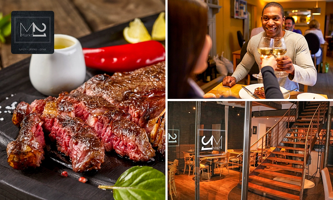 Beleef een fijne middag of avond met een 3-gangendiner of -lunch à la carte bij Bistro Markt 21: proef bijvoorbeeld de huisgemaakte kaaskroketten, een entrecote tagliata en sluit af met een coupe advocaat