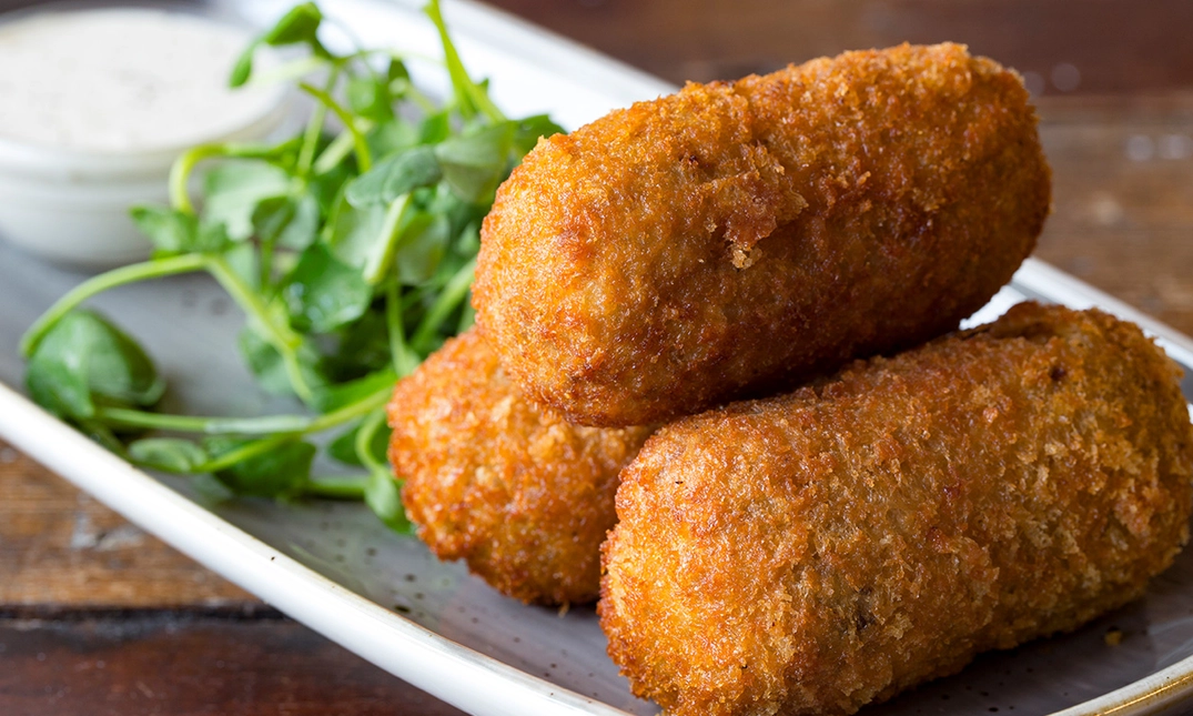 Het hoofdgerecht wordt geserveerd met friet, saus en sla