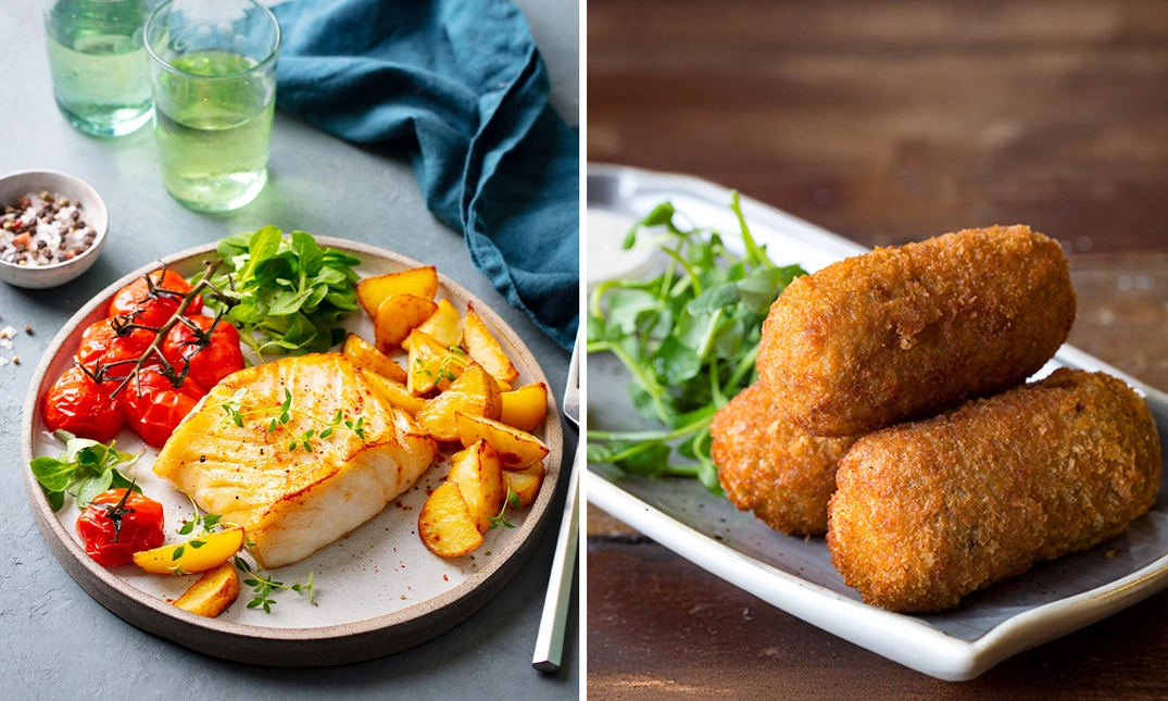 Visgerechten worden geserveerd met frietjes, kroketten, krielaardappelen, rijst of puree
