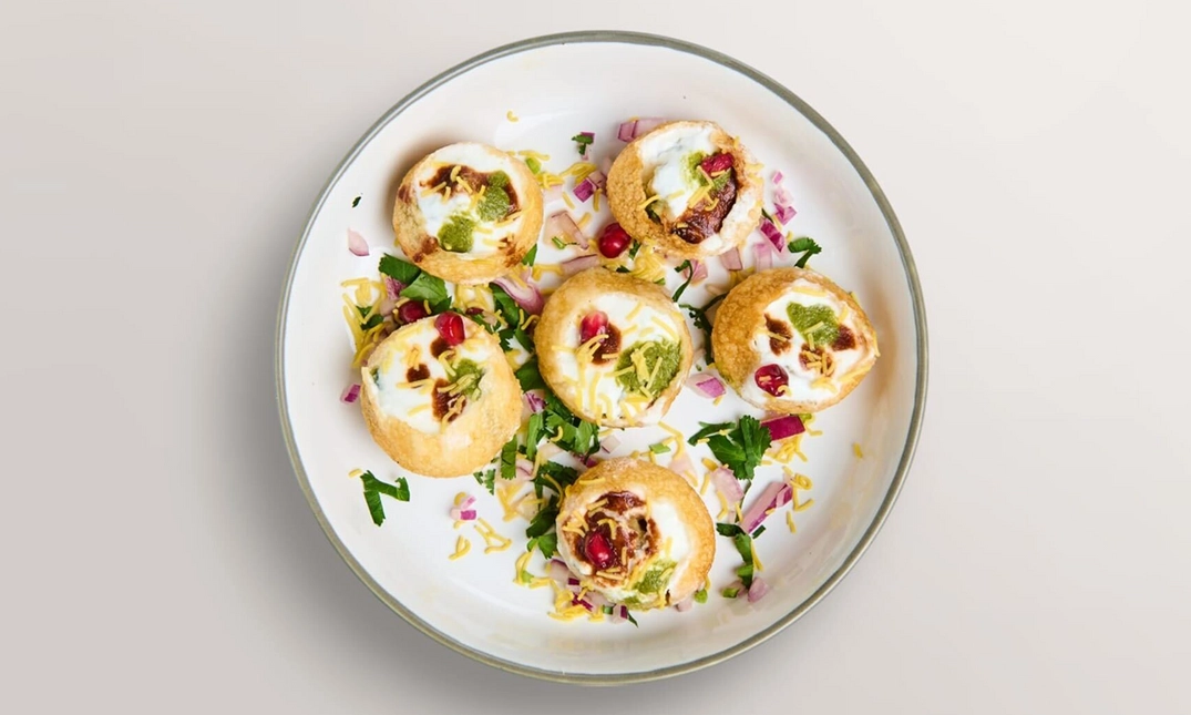 6 knusprige Puris, gefüllt mit würzigem Tamarindenwasser, Chutneys, Kichererbsen und Kartoffeln