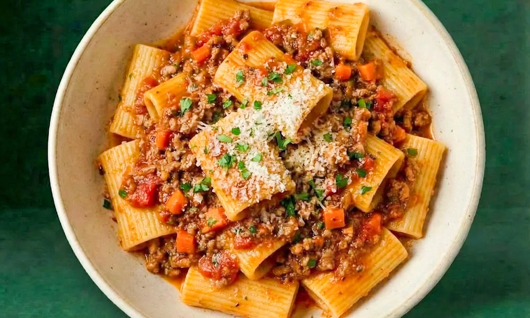 Cremige Pasta mit gebratener Sucuk und Joghurtsauce, Hirtenkäse und italienischem Parmesan und Kirschtomaten