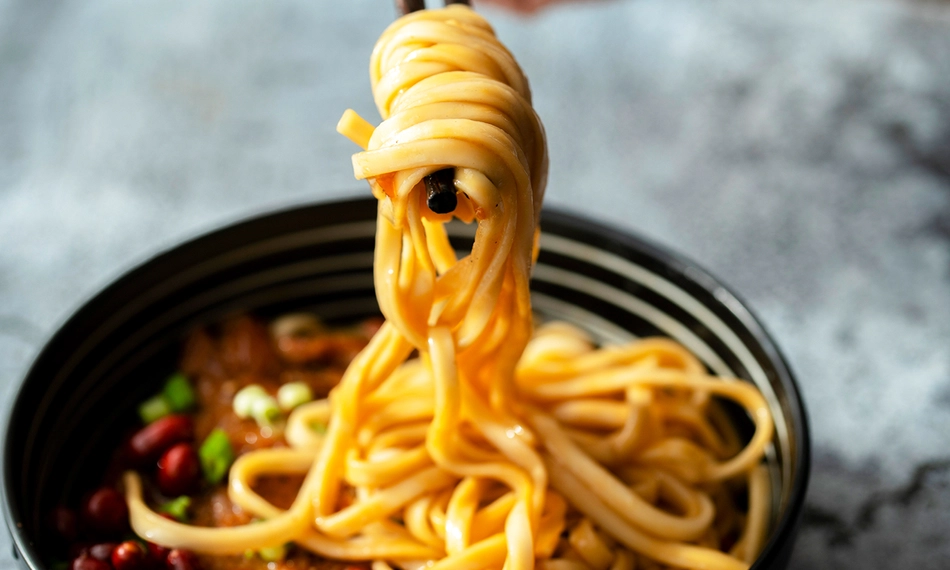 handgemachte Nudeln in einer cremigen Hafermilch-Suppe mit fermentierter Sichuan-Chili-Bohnenpaste, Tofu, Shiitake, Chinakohl, Bok Choy und Enoki, verfeinert mit Lauch und Sesam