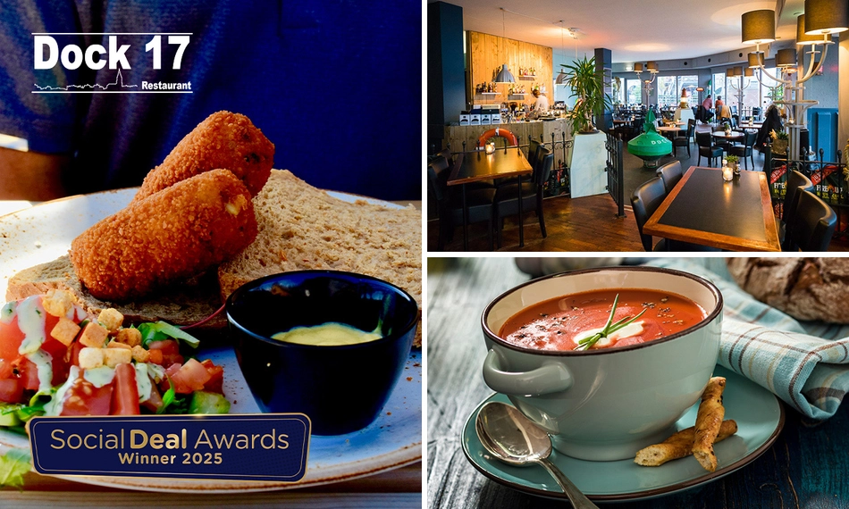 Smul van een overheerlijke 2-gangen keuzelunch bij Dock 17 in het altijd gezellige Nijmegen! Bij dit gezellige restaurant geniet je tijdens het voorgerecht van een erg smakelijk tomatensoepje, vers en huisgemaakt. Daarna zet je je tanden in een heerlijk hoofdgerecht. Kies bijvoorbeeld voor een goedgevulde lunchplank, een salade, een tosti geitenkaas of een uitsmijter. Wij wensen je alvast smakelijk eten!