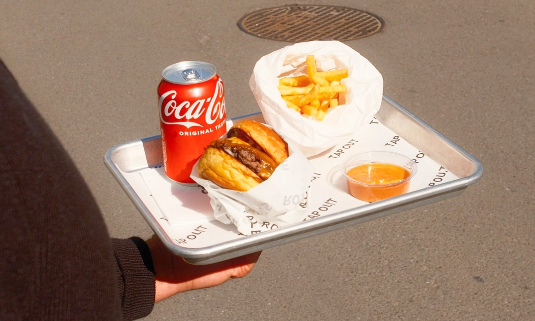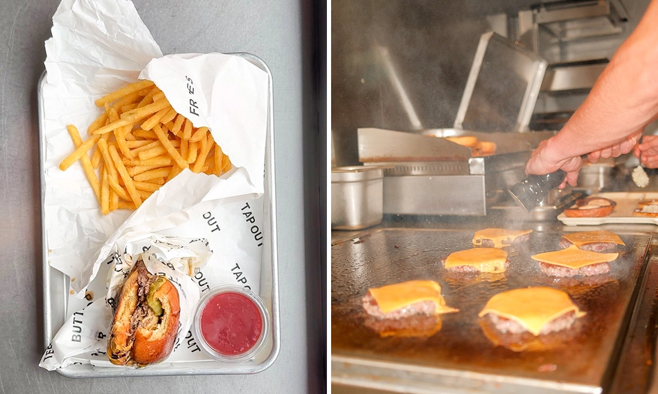 Geniet van een heerlijk burgermenu voor afhaal of dine-in bij Tap Out in hartje Antwerpen: met een burger, friet, saus en drankje naar keuze