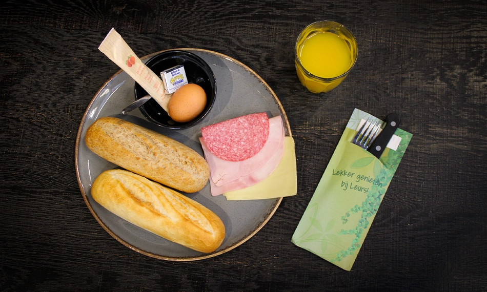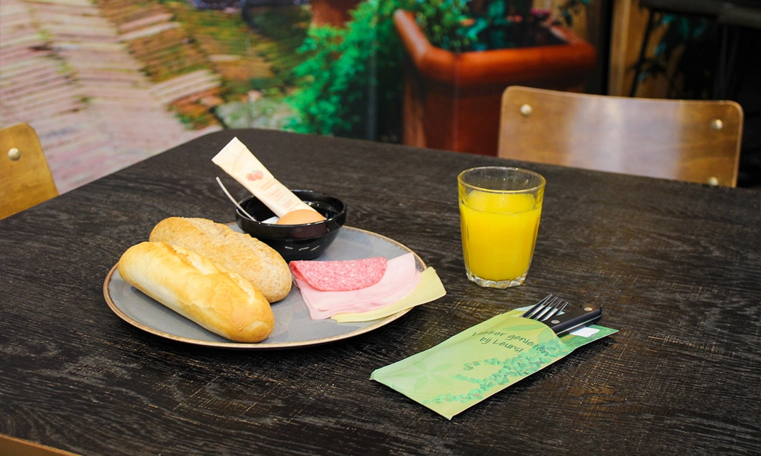 Begin de dag goed met een ontbijt in het Tuincafé of Restaurant La Piazza in Tuincentrum Leurs: pistolets, hartig en zoet beleg, gekookt ei en een glaasje jus d'orange