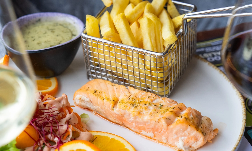 De hoofdgerechten worden geserveerd met salade en friet of pommes duchesse. Eventueel met warme groenten of ratatouille voor een meerprijs van €2,50