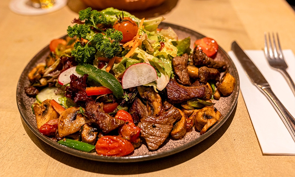 Rindfleischstreifen mit frischen Champignons gebraten auf bunten Salaten der Saison in Preiselbeer-Sherry-Dressing, serviert mit Baguette